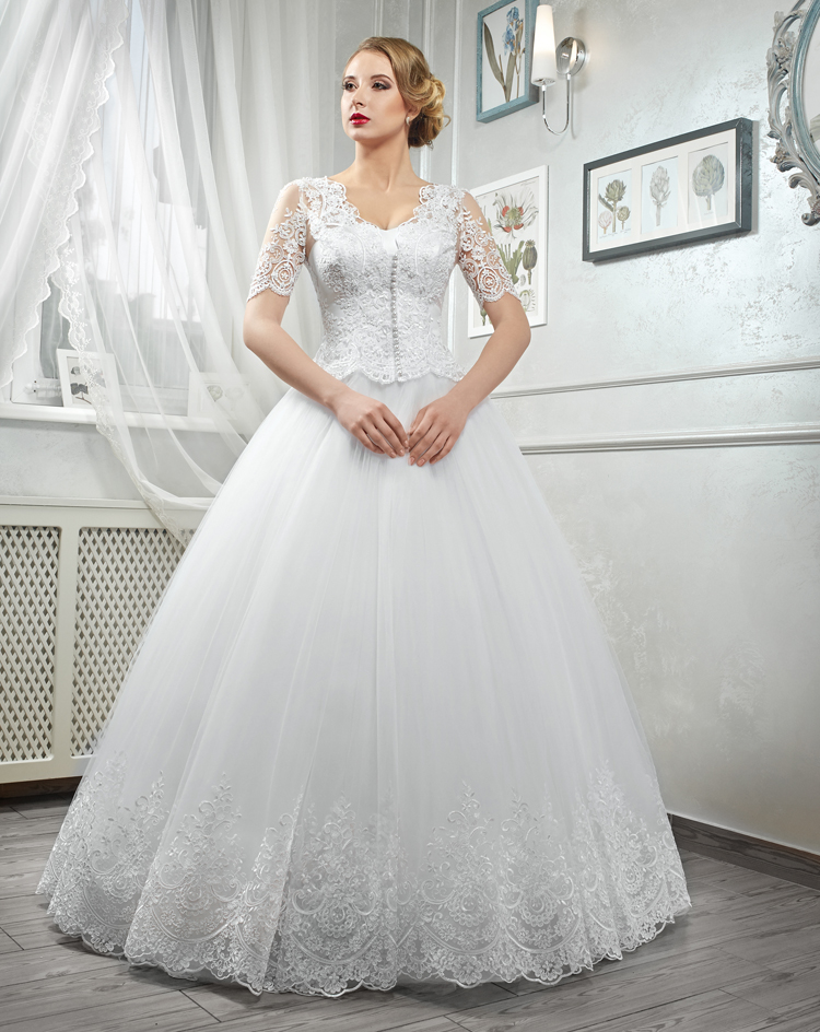 • Lace Gown With Full-Length Illusion Sleeves.